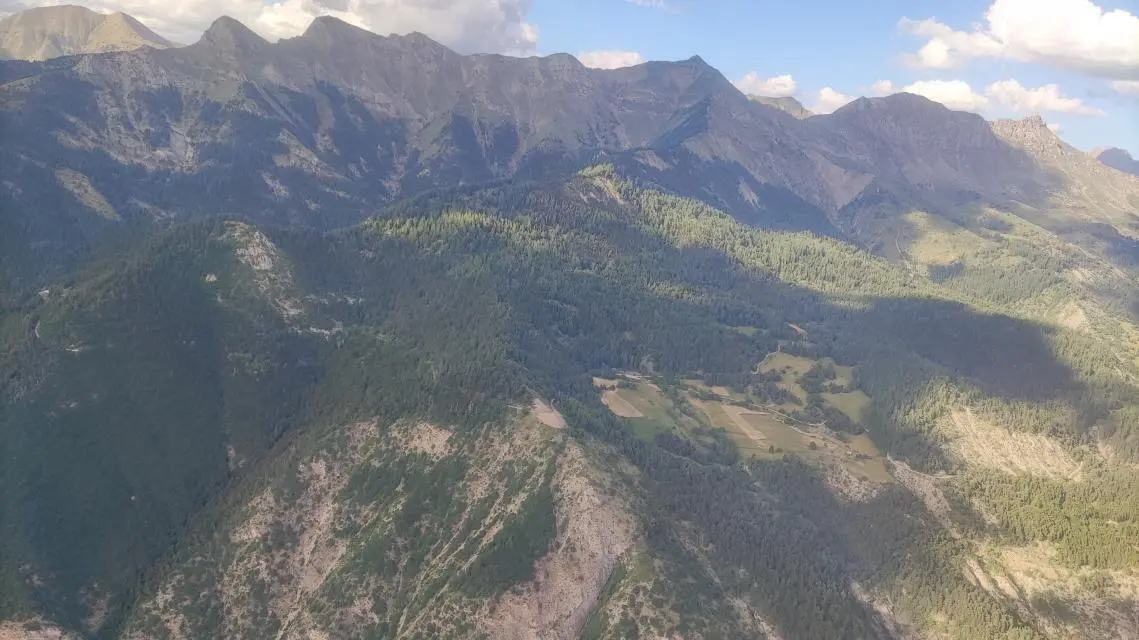 Hélas , un gros nuage met tout à l’ombre l’endroit que je visais et je ne trouve rien de consistant durant la transit .Du coup me voila radassant à 1800 m au dessus des forêts dans l’ombre . Il me reste la possibilité de poser 200 m sous le déco des jambons, remonter et attendre le soleil, ou tenter un thermique en vallée d’ici le lac.