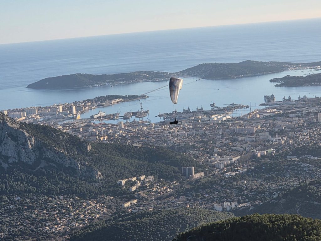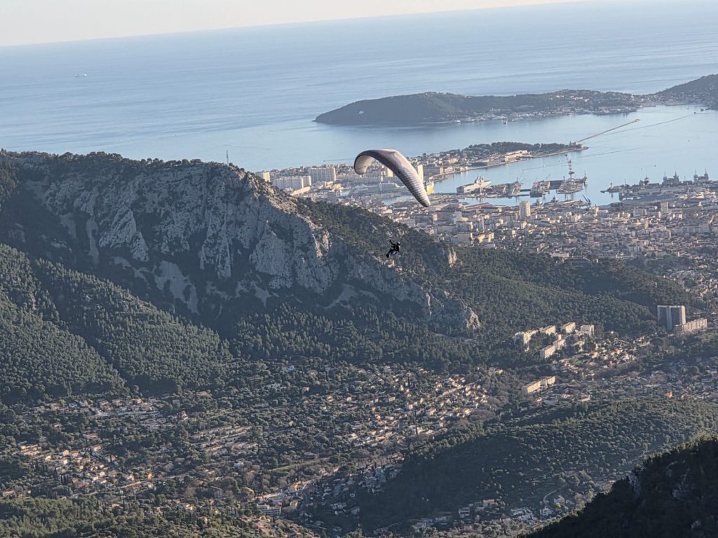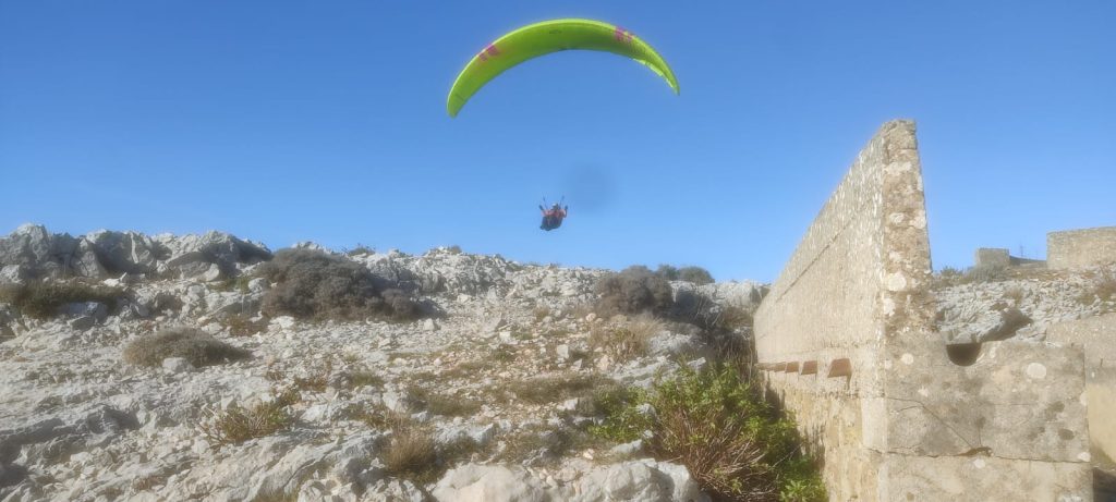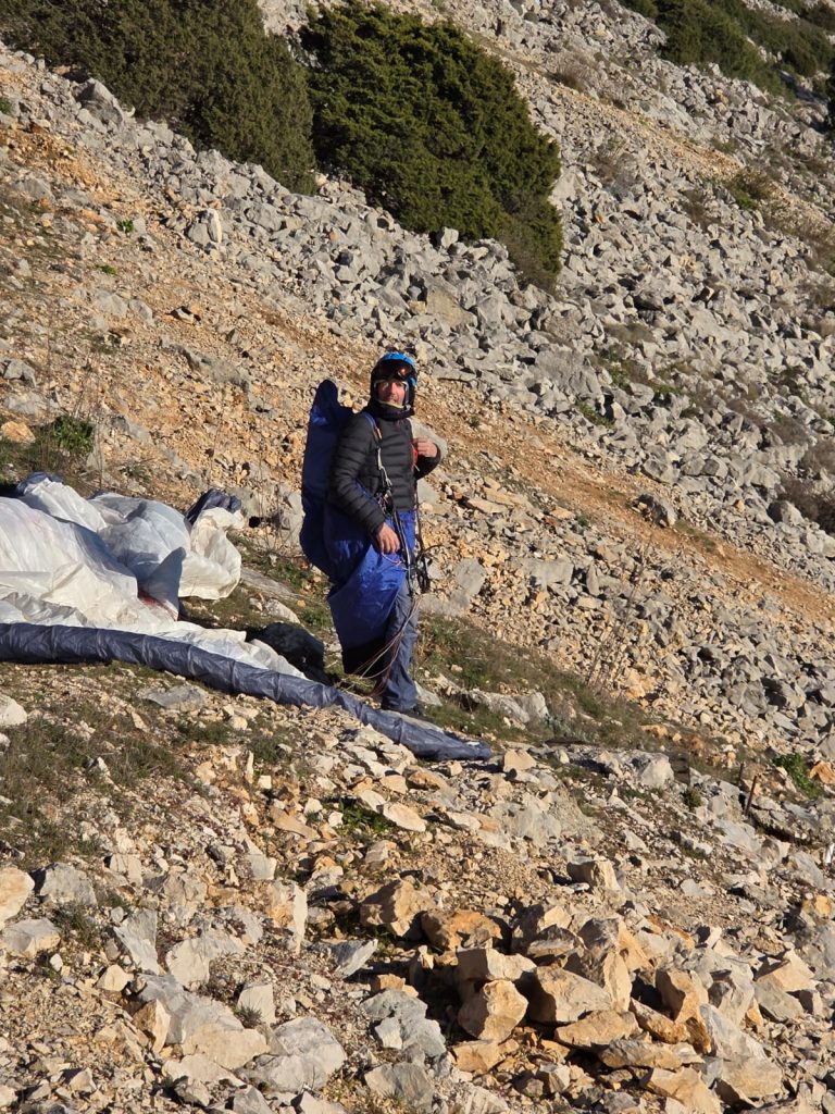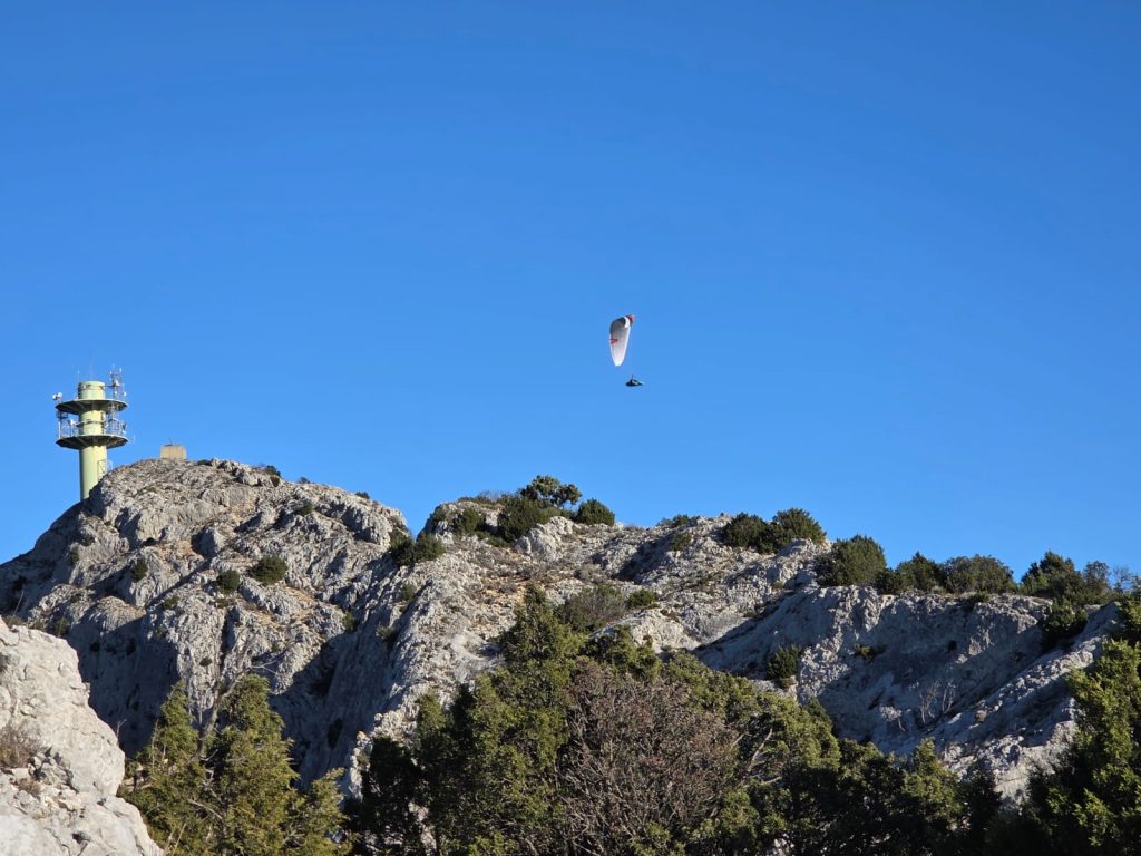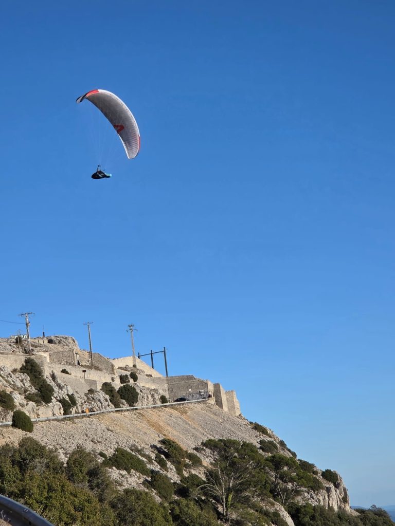 A 13h25, Guillaume se met en l’air, j’arrive à la bourre et 20 minutes après nous sommes tous les 2 en l’air, avec quelques hirondelles de rochers. Pas de trace de l’aigle de Bonelli, dommage. 12 à 15 km/h de face et des thermiques sympas qui montent au plafond à presque 1100 m. Du velours, et une lumière magnifique. On finit par se poser au col, nickel.